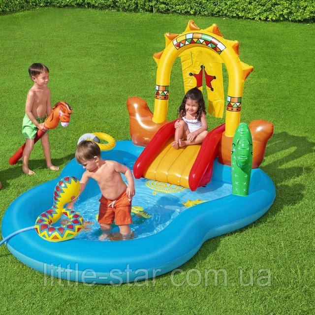 Надувний ігровий центр Bestway 53118 «Дикий захід», 264 x 188 x 140 см, з гіркою, надувними іграшками, м'ячиками.